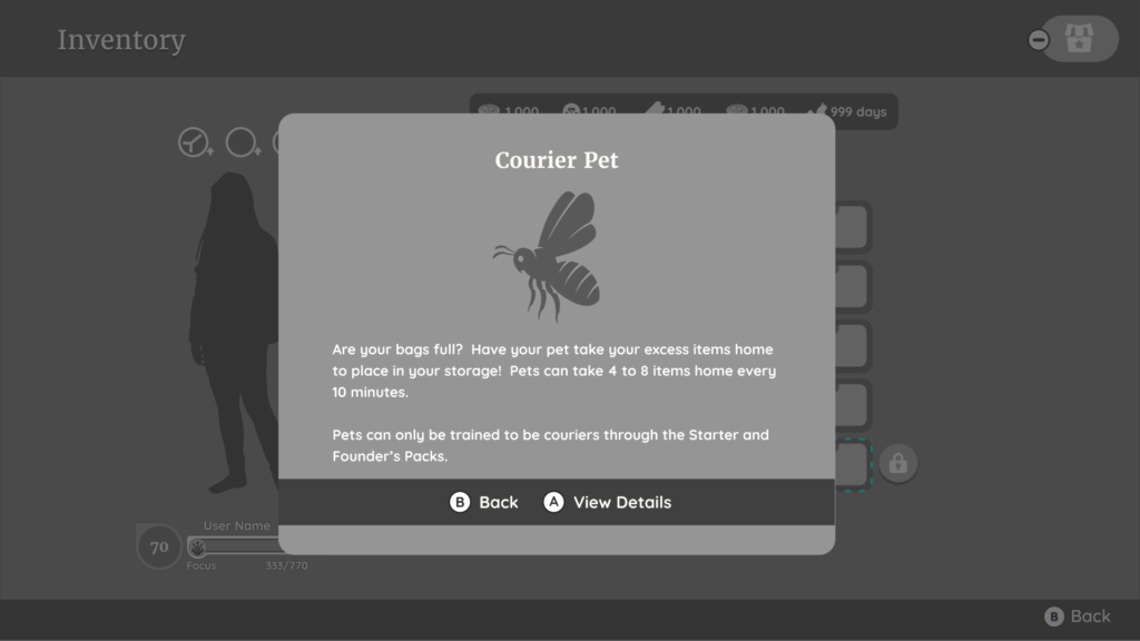 From the Inventory panel, the user will have the option to unlock the pet courier through a button.