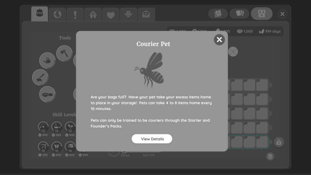 Users who have not unlocked the courier pet ability will see a Locked button. Clicking on this button will open the Pet Courier dialog that has a brief description on what the courier pet does and provides a link to the Starter and Founder’s pack page.