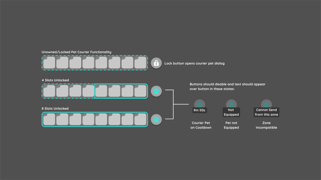 After finalizing my wireframes, and a cross disciplinary review, the design ended up slightly changing, where any row in the inventory could be used by the courier pet.